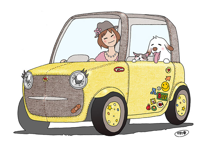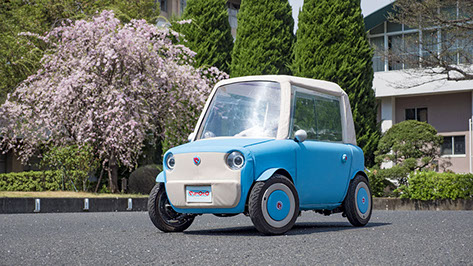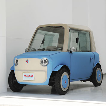 布製やわらかボディの超小型モビリティ。高齢ドライバーや歩行者も安心して共存できる「人にやさしい街」を実現する「小さい・軽い・やわらかい」自動車です。車両サイズはシングルベッドサイズほど、高齢者でも乗り降りしやすい回転シートを備えています。外装には発泡ウレタンと布を用い、着せ替えも可能です。日本感性工学会 かわいい感性デザイン賞 2016 最優秀賞 受賞。