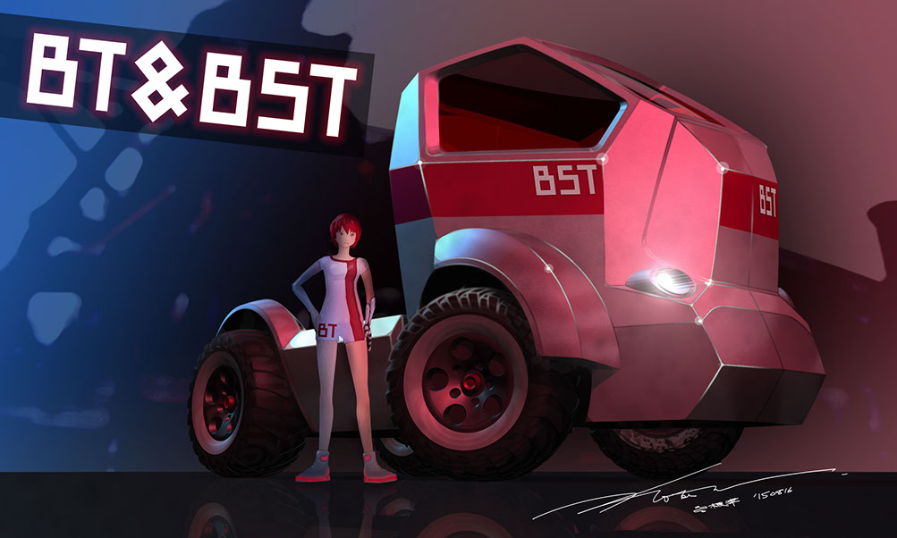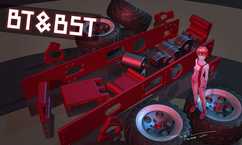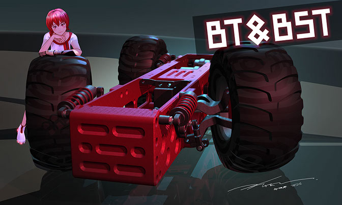 1/10サイズの精密板金製トラクターヘッドラジコン。高度な精密板金技術を持つ海内工業とのコラボレーションプロジェクトで、スタイリングデザインだけでなく、機構設計、板金設計、キャラクターデザインにも挑戦しました。2015年10月から2018年2月まで、ラジコン雑誌『RC-WORLD』に制作記が隔月連載されました。2018年1月、ドイツ・ニュルンベルクで開催される世界最大規模の玩具見本市「シュピールヴァーレンメッセ」に出展。BT&BSTは、Beauty(美女)と Beast(重機)という意味で命名しました。Beauty も今後登場予定です。2019年版は コチラ。